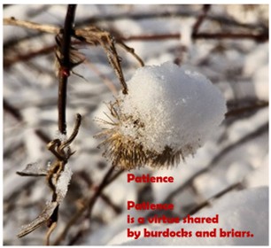This prickly, little burdock caught my eye. It seemed to be waiting patiently, its little hooks buried under a drum major's hat of snow, dreaming of spring’s passing rabbit.