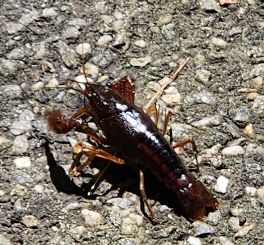 The day before, I saw three crayfish crossing the road near a stream. Why not stay in the water through the tunnel that goes under the road? Why climb up to the road and risk the vulnerability of crossing on pavement? I wonder.