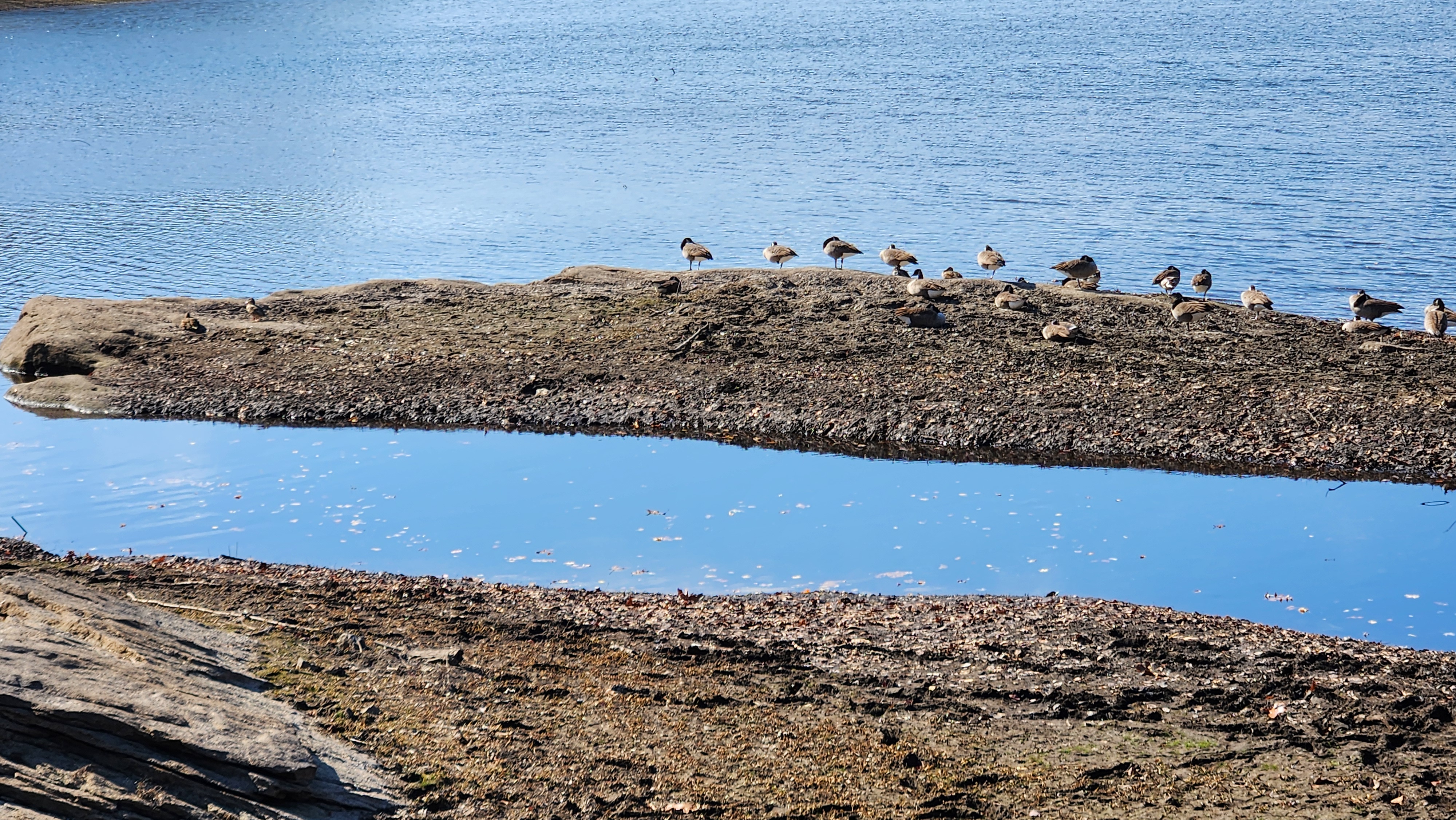 The topic of fire is timely because for the first time in my memory, there are forest fires in two neighboring towns. Forest fires don’t often occur in Connecticut, but it has been extremely dry here. While floodwaters engulf other parts of the country, here lawns brown, trees wither, and reservoirs dwindle. This mud and rock island in a nearby reservoir is normally deep underwater, but today, geese rest on their way south.