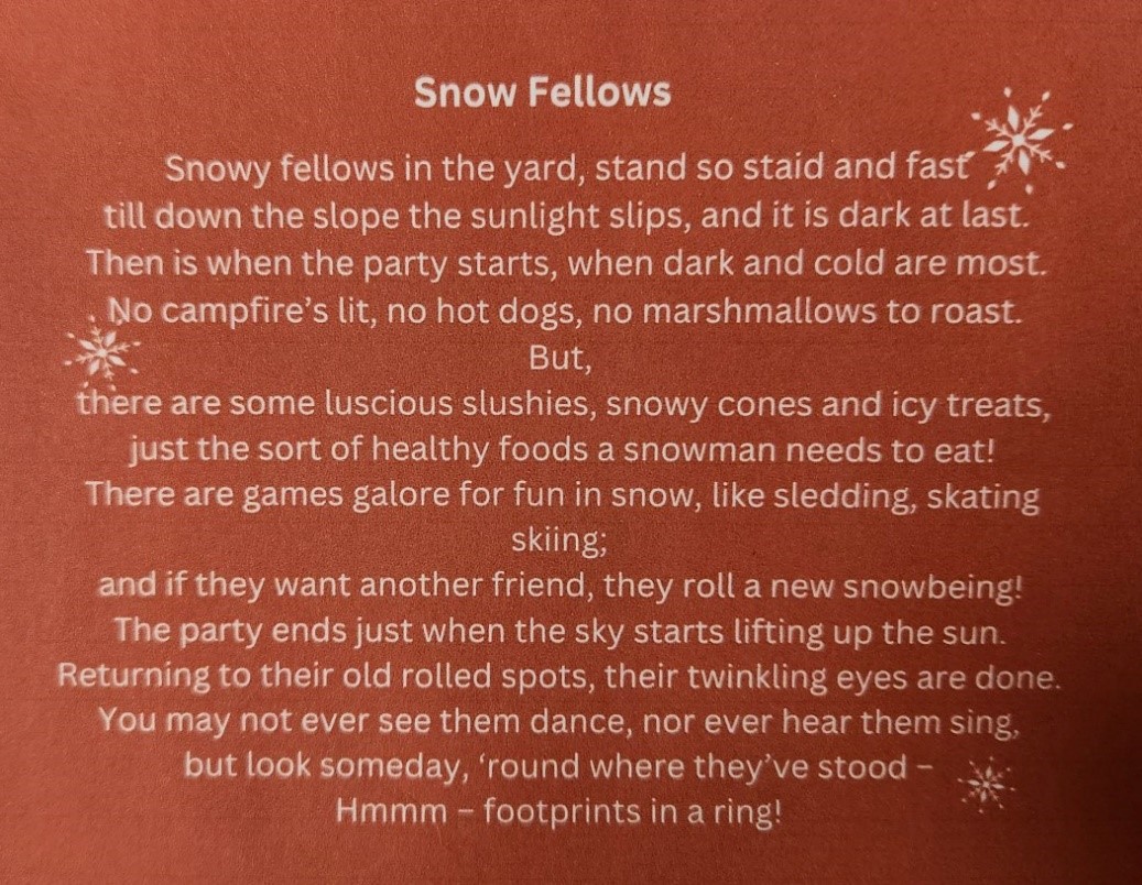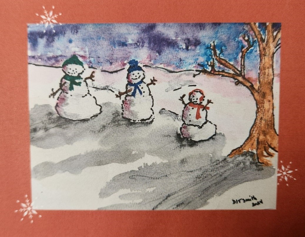 I would also like to thank Donna Smith, my Poetry Friday Holiday Buddy, for her thoughtful gifts. She sent me her seasonal artwork and poem that made me want to run out and build a snowman! Her snowpersons, bedecked in scarves and mittens, party it up as their shadows stretch in the moonlight. I loved this line in her poem: and if they want another friend, they roll a new snowbeing! : )