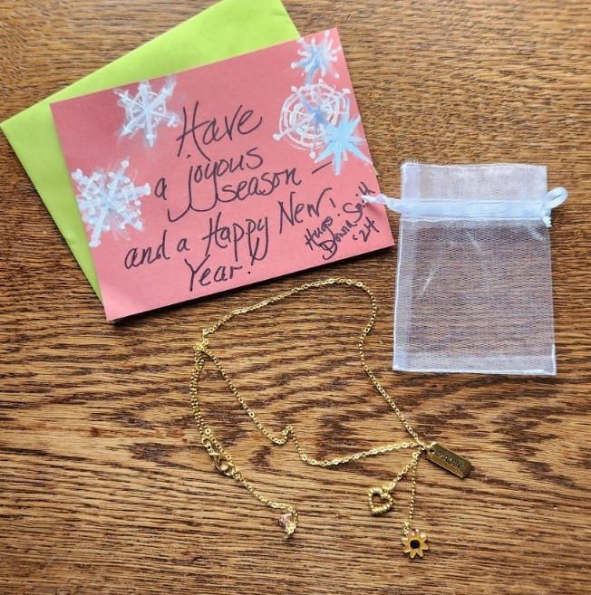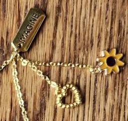 But that’s not all! Donna also sent me a handmade necklace with three pendants: a flower, a heart, and the single word – IMAGINE. That felt so apropos! Sometimes when I write, I get bogged down in the “rules,” and the necklace from Donna felt like an invitation to let go and imagine what could be. Thank you so much, Donna!