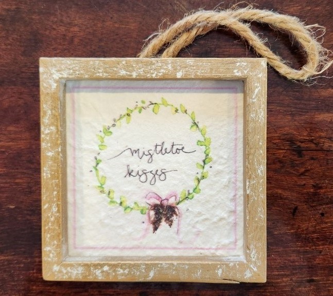 In keeping with the “mistletoe kisses” theme, Carol sent this ADORABLE ornament, which I absolutely love and promptly hung in our living room.
